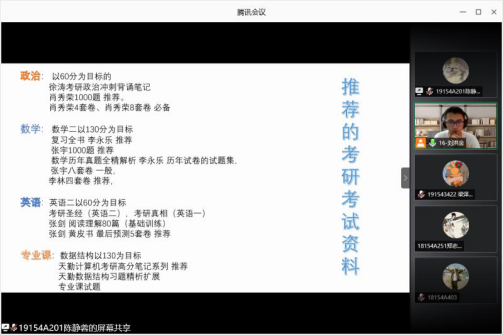 6月27日,买球官网在腾讯会议平台举办考研分享交流会。院党总支副书记丘志君、辅导员钟培权、辅导员陈兴出席了会议,2020届考研成功优秀毕业生陈彩凤蔡浩锋刘洪金莫咏莹和李浩彬应邀与80多名师弟师妹分享交流考研经验和方法,会议由陈欣瑄同学主持。