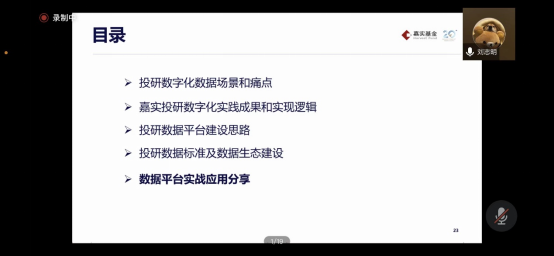讲座中,刘志明结合自己创建Tushare金融大数据开放社区和在头部金融机构担任首席数据架构师的工作经历,首先介绍了当前金融机构开展投研数字化的业务场景和需求痛点;以此为背景,系统阐述了嘉实基金打造的“端到端投研数据中台——一站式投研服务平台——一体化智能投研系统”三级投研数据平台的体系结构;进一步说明了数据平台的建设思路、投研数据交换传输标准和投研数据生态建设等关键环节步骤;随后通过数据平台的一些具体应用案例展示了数据平台的功能和应用前景;并补充介绍了高校用户如何更高效地利用Tushare金融数据开放平台为学习和研究服务。