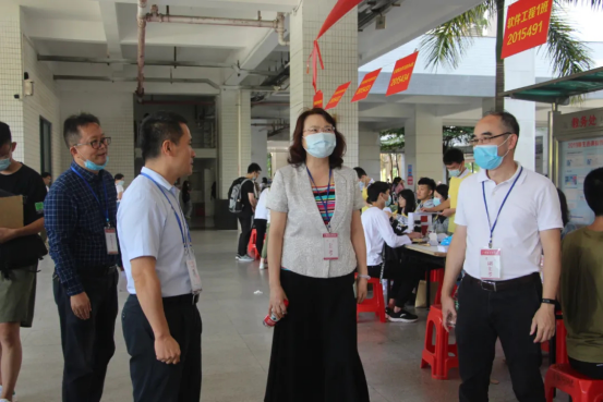 图3:院党总支书记朱小焱(右四)、副书记丘志君(右五)、招就处副处长孔祥燊(右六)等指导参与迎新工作