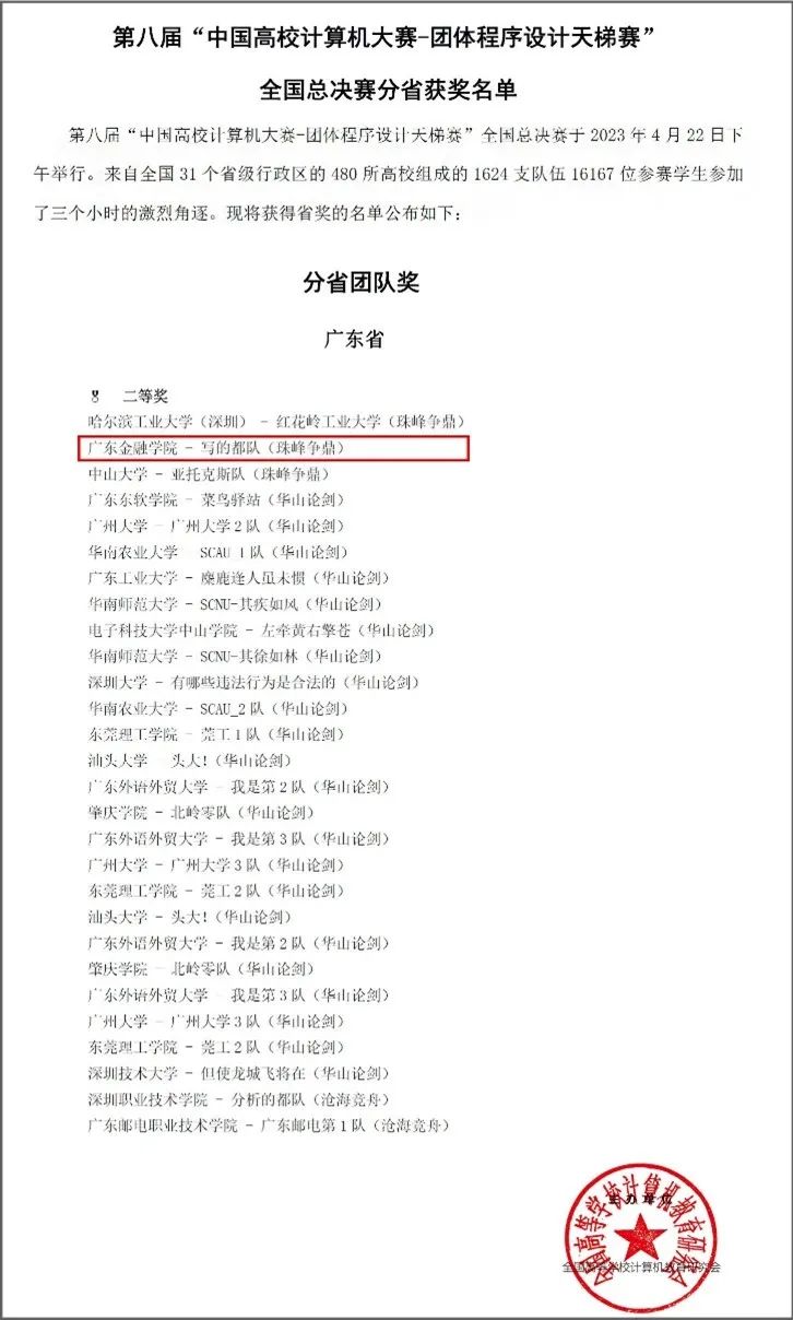 买球官网互联网金融与信息工程学院学生徐展鹏、廖斌锴、杨煌、谢李贝蕾、曹家豪、胡主艳、陈萃薇、陈思涛、陈欣琳及汤雨杭等10位同学组队“写的都队”队参加了难度最大、级别最高的珠峰争鼎组比赛。经过激烈角逐,买球官网喜获两个奖项:(1)团队获得广东省团队二等奖(二等奖组别总分全省排名第二);(2)徐展鹏同学获得国奖个人三等奖。这也是买球官网首次在该赛事斩获奖牌。