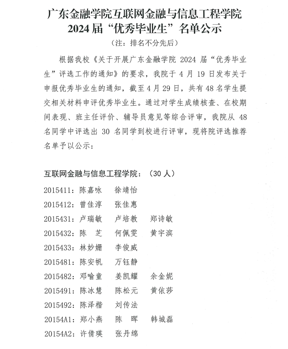 十大买球的正规网站互联网金融与信息工程学院2024届“优秀毕业生”名单公示