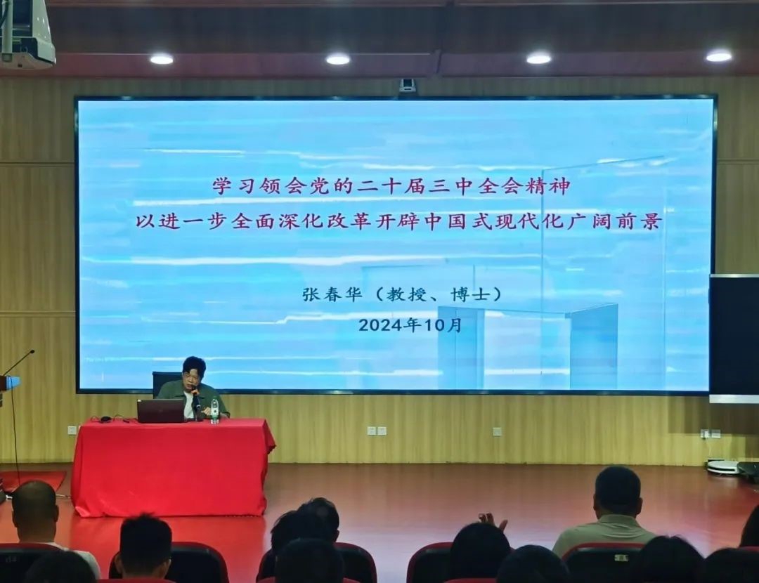 党课由马克思主义学院教授张春华主讲,张春华教授以《学习领会党的二十届三中全会精神 以进一步全面深化改革开辟中国式现代化广阔前景》为题,从党的二十届三中全会(决定)的文本比较、主要内容、以高质量发展全面推进中国式现代化、教育工作者推动中国式现代化的使命担当等四个方面领学了全会精神。课程内容脉络清晰、切合实际,语言生动形象、深入浅出,课程引导大家准确把握了本次全会在中国改革开放进程和中国现代化进程中的历史方位,深刻领会全会主题和重大意义。