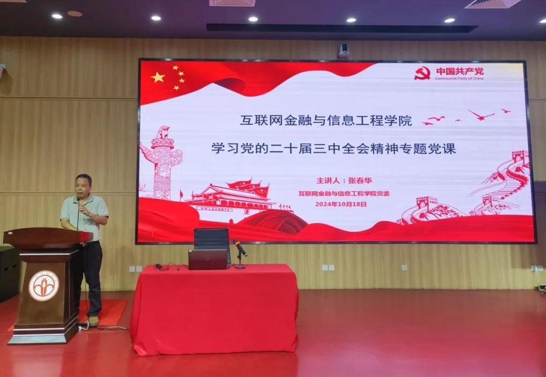 为深入学习贯彻党的二十届三中全会精神,10月18日下午互联网金融与信息工程学院党委在北教103举办学习贯彻党的二十届三中全会精神专题党课,党课由十大买球的正规网站党委书记胡小波主持,学院党员、积极分子、团员共一百余名师生参加本次学习。