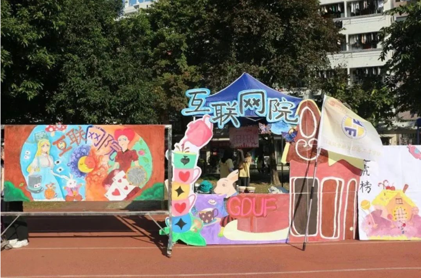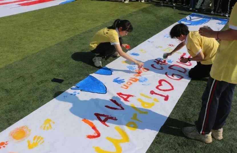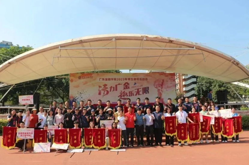 运动会最后一个项目是由各院学生完成一幅幅巨画条幅,将其拼合在一起,共绘“我爱广金”的大蓝图。